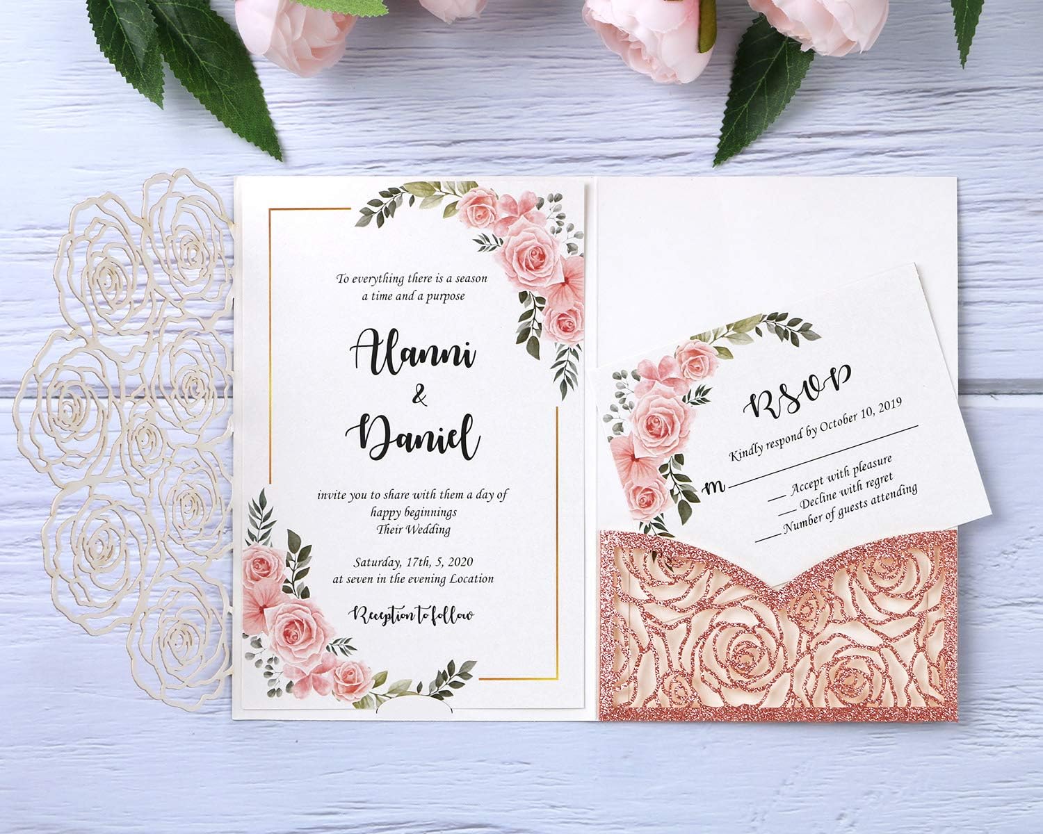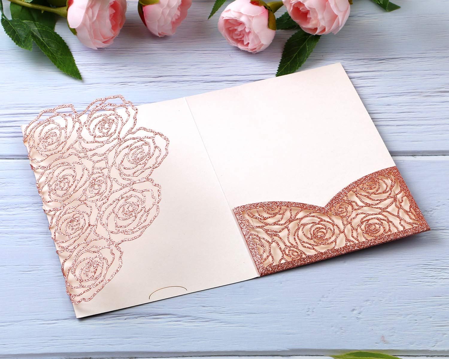20 Pcs Laser Cut Wedding Invitations Card Pocket with Envelope for Birthday Party Baby or Bride Shower Invite suitable for 5 * 7 Inches Insert Paper (Rose Gold Glitter)