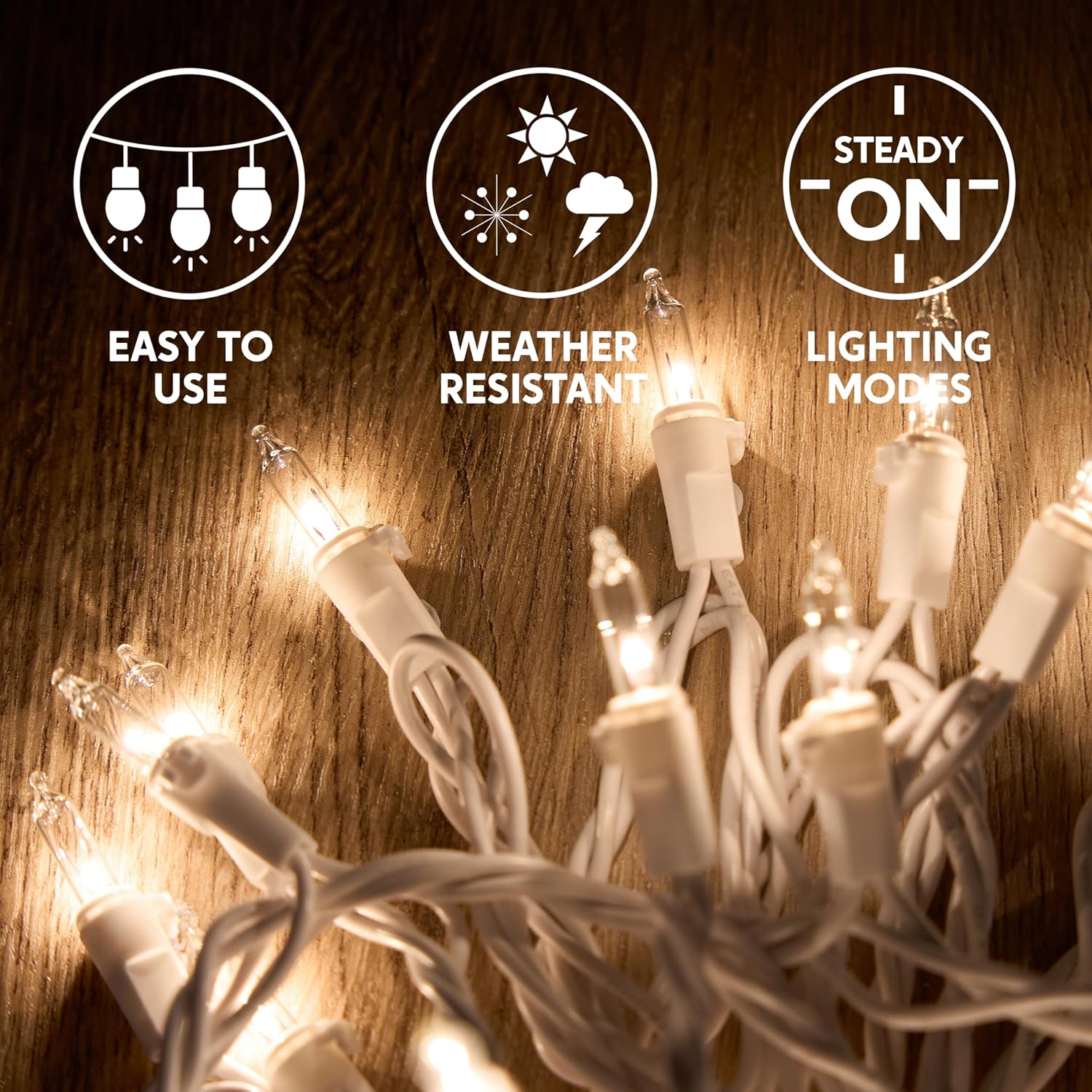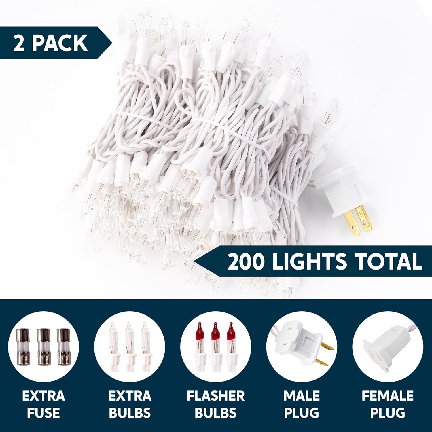 - Value 2-Pack: Each set includes 100 warm white T5 bulbs with 21.4ft cords.200 warm white T5 bulbs with 42.8ft white cords provide 38.8ft of lighting length and 2.36 inch spacing for a brilliant light effect. These high-voltage Christmas lights provide dense, vibrant illumination, perfect for decorating your tree, roof, or mantelpiece for a classic holiday look.