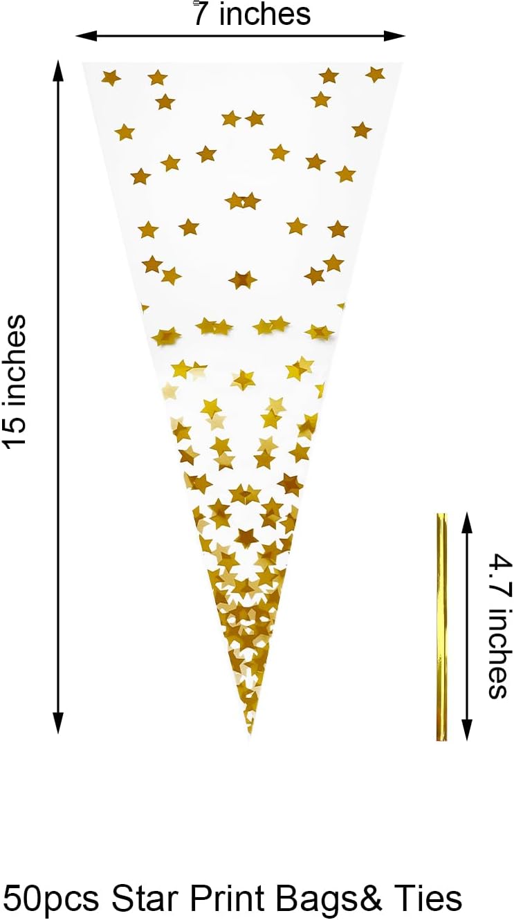 - 【Unique Triangle Design & Festive Print Options】: Featuring a unique cone shape with multiple print options, including clear, gold stars, and colorful sprinkles, these bags add a festive touch to your packaging. Choose from transparent or printed designs to match any occasion, making them perfect for seasonal celebrations and parties.