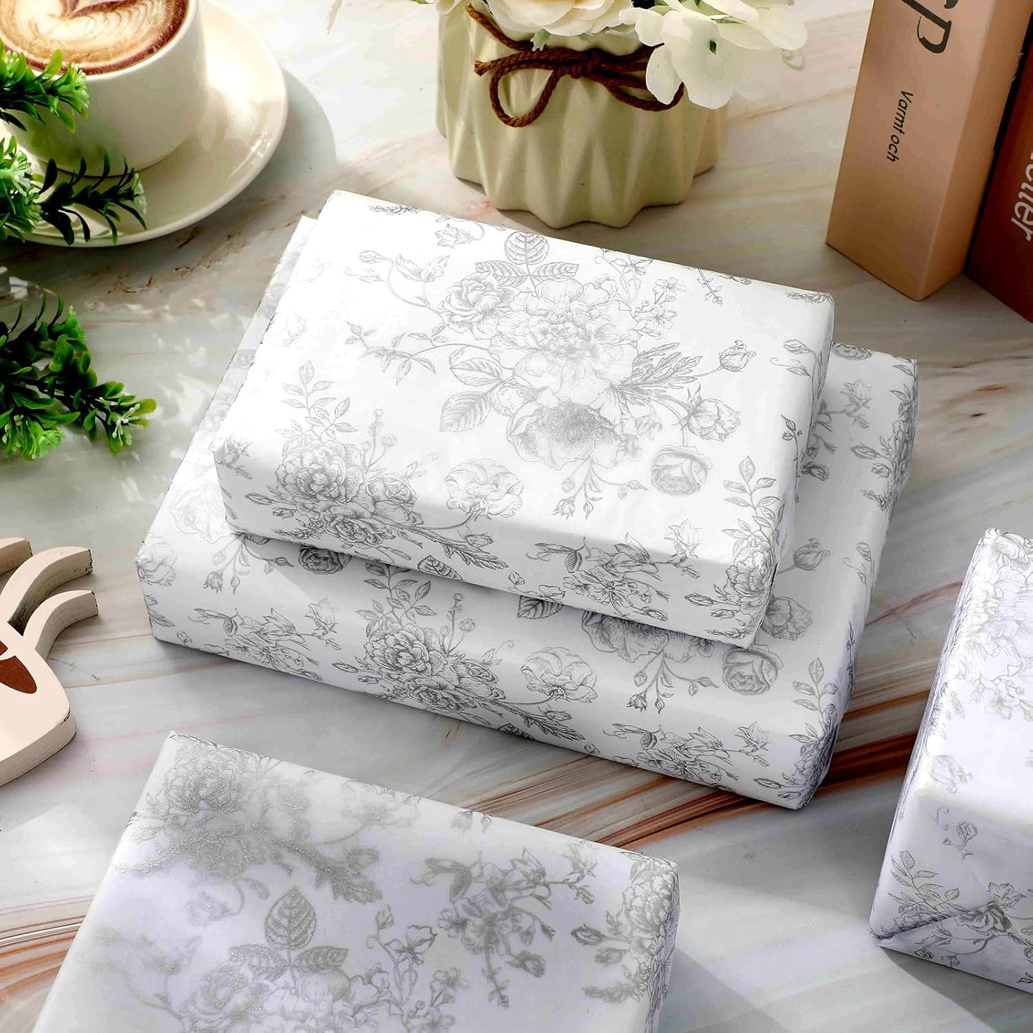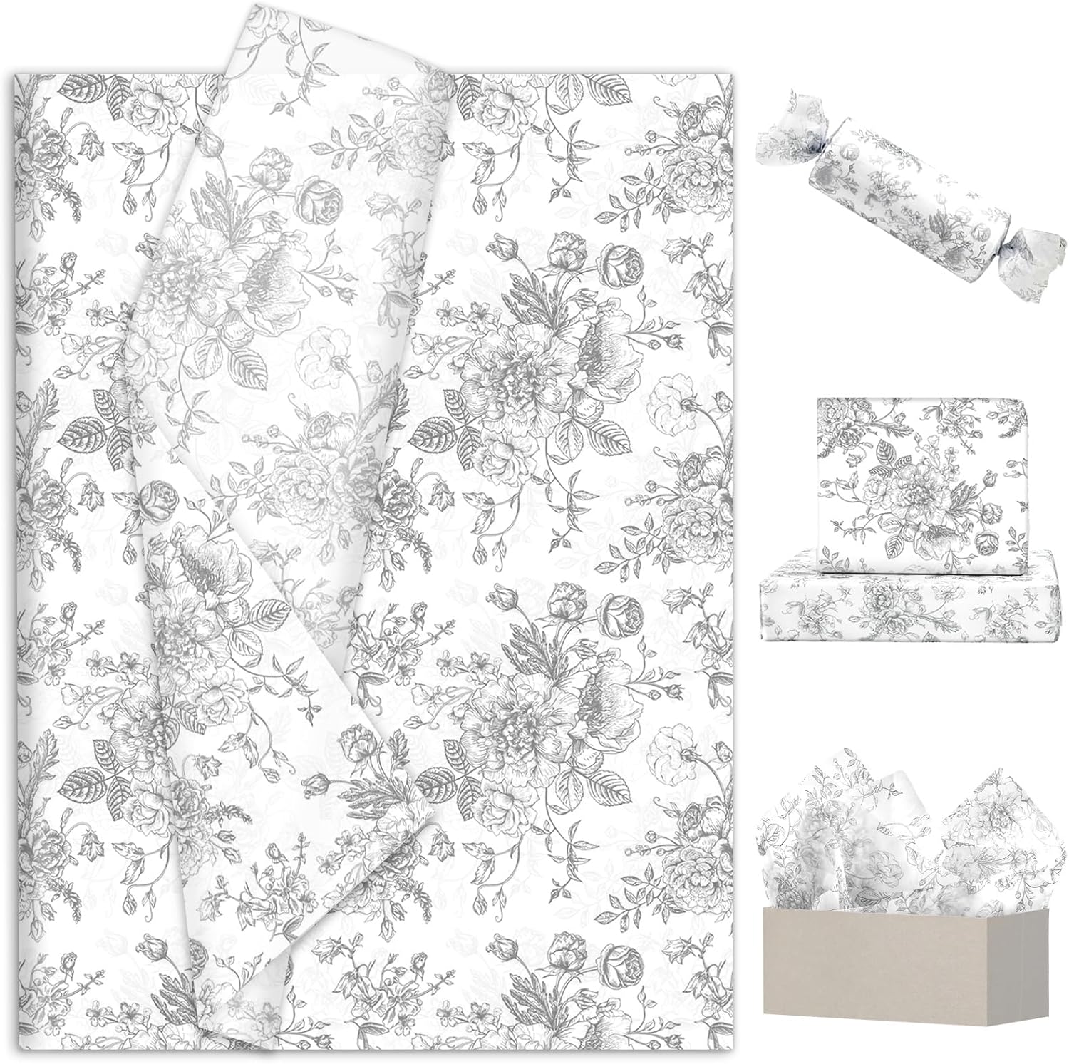 JarThenaAMCS 100 Sheets Floral Tissue Paper Silver Flower Gift Wrapping Paper Vintage Decorative Art Paper for Home Party DIY Crafts Supplies, 14 x 20 Inch