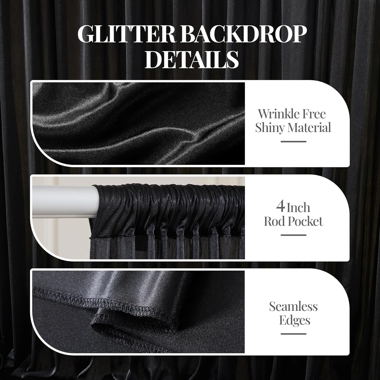 - 【Stunning Black Curtains Material】Our sparkly backdrop curtains panels are super shiny and catch the light beautifully. But the product name there are no actual sequins on these curtain panels, the backdrop drapes is a really soft spandex satin fabric with glitter/sparkles that gives it a nice texture. They are wrinkle free, and nothing will fall off of it. It's a perfect backdrop for any party and they will be able to elevate the look of your decoration.