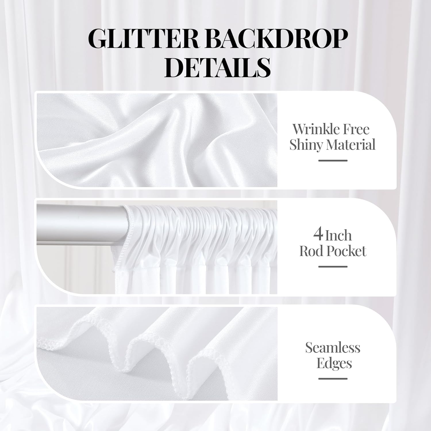 - 【Stunning White Satin Curtains Material】Our sparkly backdrop curtains panels are super shiny and catch the light beautifully. But the product name there are no actual sequins on these curtain panels, the backdrop drapes is a really soft satin fabric with glitter/sparkles that gives it a nice texture. They are wrinkle free, and nothing will fall off of it. It's perfect for the backdrop for any party and they will be able to elevate the look of your decoration.
